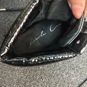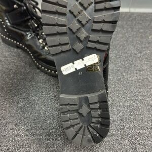These Lola combat boots feature a striking black glossy finish and a line of silver studs along the welt for a bold punk-inspired look. The high-top design provides ankle support while the thick rubber sole ensures durability and comfort.