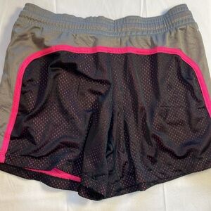 In excellent preowned condition! Nike women’s running shorts in a bundle of 2 size medium. Colors are black, gray, bright pink and a purpleish pink. The black pair are a little bit longer and made of basketball short material. The purpleish pink pair are shorter with a liner and a zipper pocket in the back.