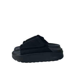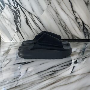 Elegant yet edgy slide with a quilted upper in technical fabric with Velcro closure and chunky lug soles. ☺️