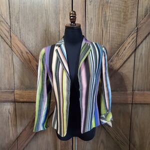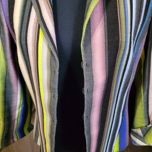 Vibrant striped blazer by Akris. bold mix of colors. size 8. cotton material. excellent condition. hook closure.