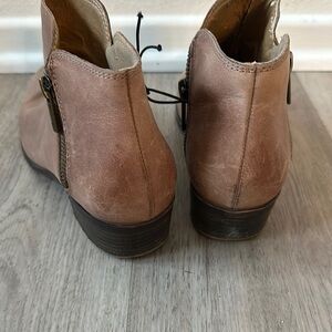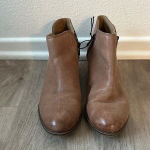 Stylish brown ankle boots with a convenient side zipper. Perfect for any casual outing. Leather stacked heel. Lightly used.