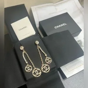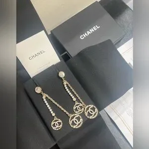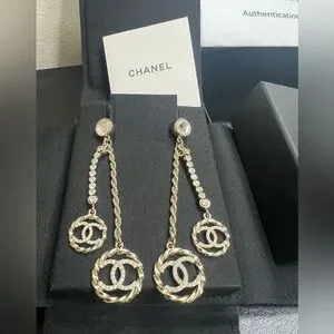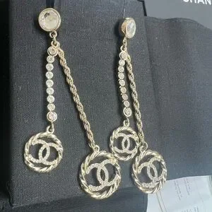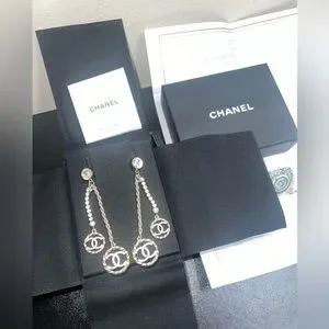 Elegant Chanel drop earrings featuring a stunning gold and silver design. Perfect for adding a touch of luxury to any outfit.