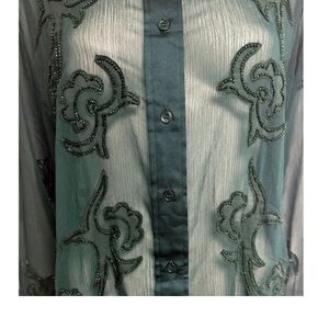 This elegant sheer blouse features intricate floral embroidery design, perfect for adding a touch of sophistication to any outfit. The deep green color enhances its luxurious appeal. Size M