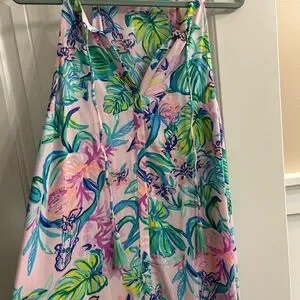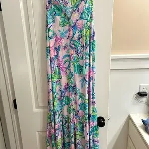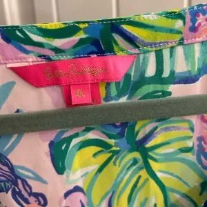 Vibrant tropical print dress by Lilly Pulitzer. Features a mix of green, blue, and pink hues. XL very light and flowy. Worn once and dry cleaned. Smoke and pet free home. This dress is so pretty but I need to make room for new items. Hard to find print!