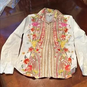 Vibrant floral patterned button-up shirt with a mix of colors. Perfect for adding a pop of color to your wardrobe.