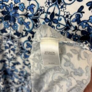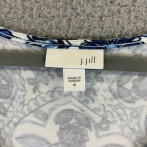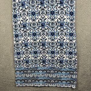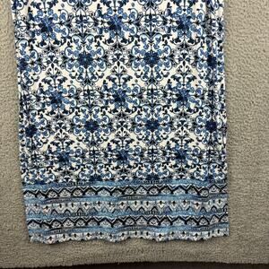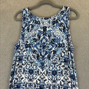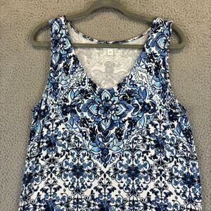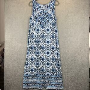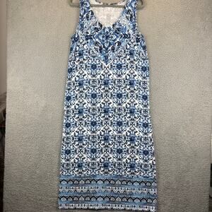 • Style: J Jill Dress Midi Tile Print Jersey Knit Stretch Side slits Comfort Blue White Boho Island Vacation Cruise Summer fun Beach Coastal