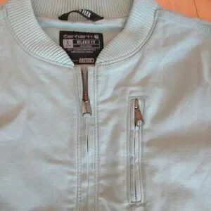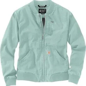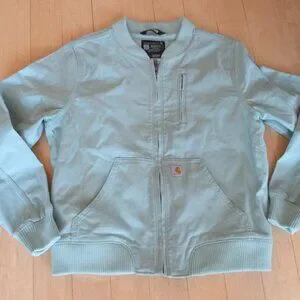 New Carhartt Canvas Bomber jacket, ribbed collar/hem, color is blue surf (green/blue color), zip up, 2 pockets, womens large (12-14).