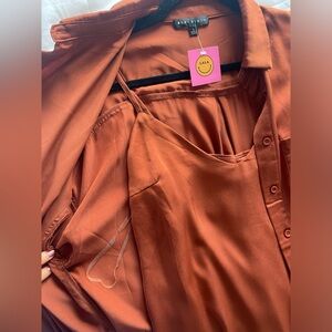 NWT DRESSED IN LALA SILKY SLIP AND BUTTON DOWN TOP SET COGNAC