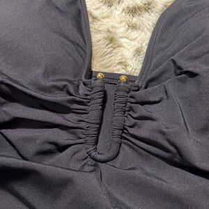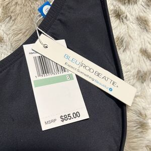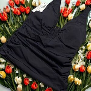 A sophisticated swim look begins with this tankini top from Bleu by Rod Beattie, a sleek solid with a U-notch between the bust and soft ruching at the front.