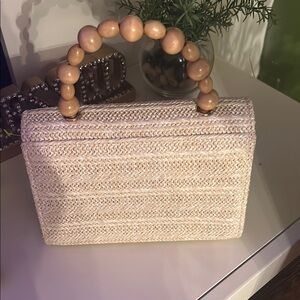 This elegant cream woven handbag features a stylish wooden handle, perfect for adding a touch of sophistication to any outfit. Ideal for both casual and formal occasions.