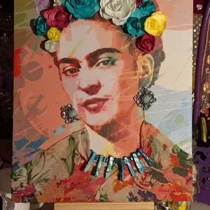 Vibrant canvas art featuring Frida Kahlo with a colorful floral design. Perfect for adding a splash of color to your home decor.