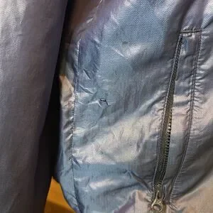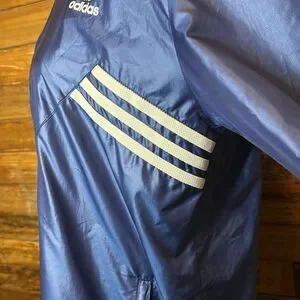 Adidas women’s blue hooded windbreaker large small blemish above white pocket completely and noticeable
