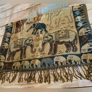 This luxurious pashmina shawl showcases a stunning elephant motif design & a decorative fringe. 100% cashmere. Excellent preowned condition, normal signs of wear - see flaw in last photo.