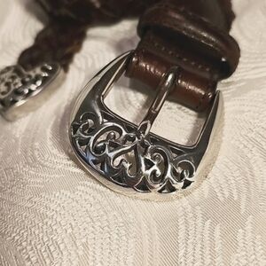 Womans size 30 braided bourbon brown leather belt silver tone heart shaped filigree buckle very good condition