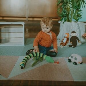 Look who's just slithered in from the Jungle! Covered in bright green and black stripes and quirky yellow spots, this plush snake is a charmer for sure! This kids toy is the perfect size for little hands to grab and shake.