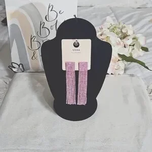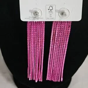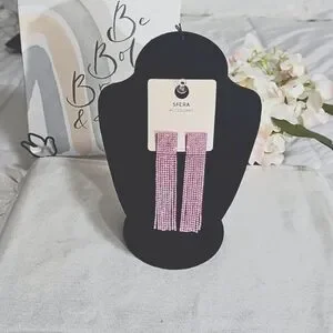 The earrings have a rectangular or slightly curved top part from which multiple strands of pink rhinestones and crystals hang down, creating a tassel or fringe effect. This is perfect for that special occasion. The picture does no justice to the actual item.