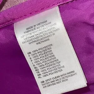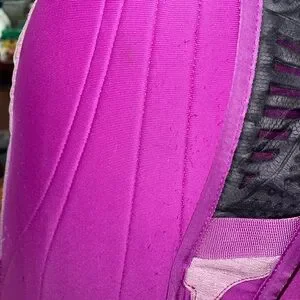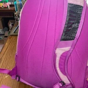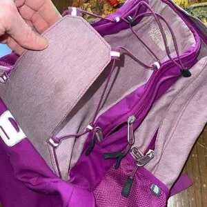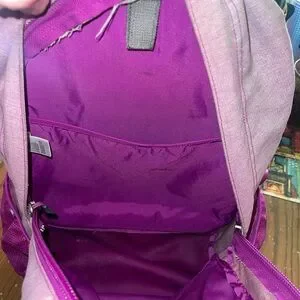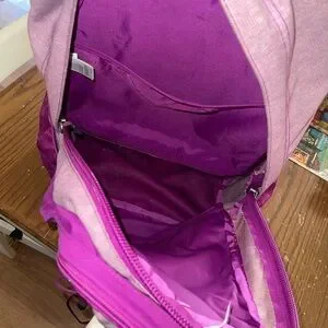 Good used condition-purple and pink The North Face Jester backpack. the brand's logo prominently displayed on the front, along with a bungee cord system for securing items. It has a padded laptop sleeve, simplified organization, and can stand up unsupported.