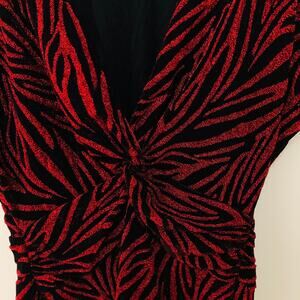 Features: glitter metallic red and black zebra print, mini length, short sleeve, slightly fitted material but extremely stretchy.