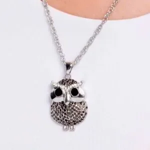 A silver owl pendant, encrusted with hematite and white rhinestones and featuring black gem eyes, swings from a twisted silver chain, adding a whimsical yet sophisticated touch. Features an adjustable clasp closure.