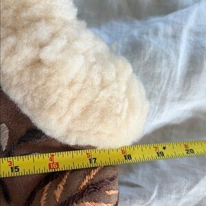 Cozy shearling vest with intricate embroidery. Features cream and brown tones with orange and white accents.