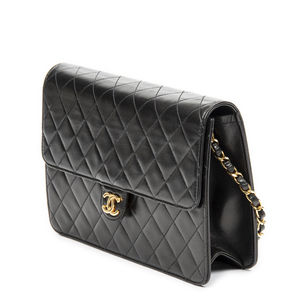 Chanel Shoulder Bag CC Push Lock Straight Single Flap in Black Quilted Lambskin Leather and Gold hardware. The product is in Excellent Condition (A).
