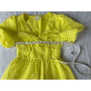 This is a cute brand-new dress perfect for summer. It has balloon sleeves and in a mini dress style. Bright, eye catching yellow in size extra-small. Measurements are in the pictures. There is a makeup stain on the back that I pointed out. Would probably come out with a stain treatment and a wash. I do have it pictured, although it didn't show on camera very well.