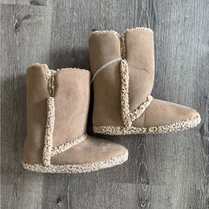 Warm and stylish tan slippers/boots with shearling lining. Perfect for cold weather. Size 7/8 new with tags