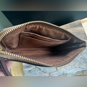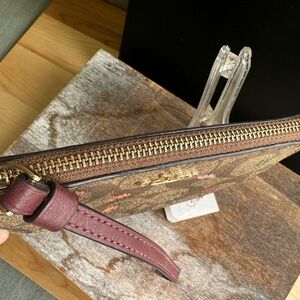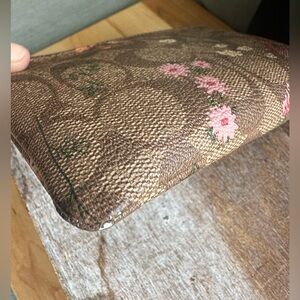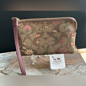 This Coach wristlet features a beautiful brown floral design, perfect for adding a touch of elegance to any outfit. The compact size and wrist strap make it ideal for on-the-go convenience.