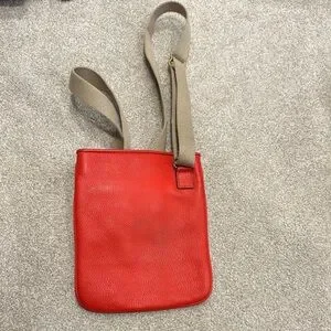 This Michael Kors crossbody bag combines vibrant red leather with a contrasting tan strap for a chic look. The gold-toned emblem adds a touch of elegance, making it a stylish choice for any occasion. Its structured design ensures both fashion and functionality.