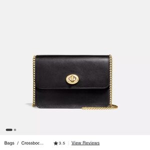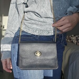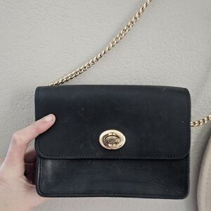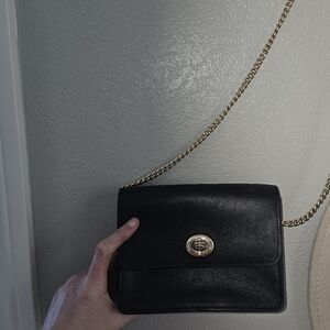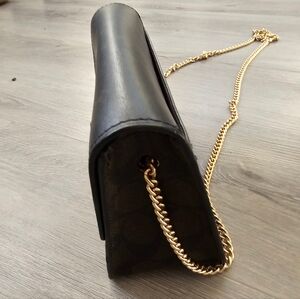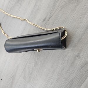 Elegant black leather crossbody bag with gold chain accents. Perfect for any occasion.
