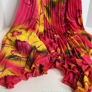 Accordion-pleated free flowing dress gives effortlessly movement on the body. Adjustable spaghetti straps. Front neckline has mini ruffles standing upward, and is enhanced by a drawstring which ties into a bow. Dress is crafted from a bold pattern beach style print. The fluid silhouette of the entire dress give a beach vibe. Wear on a cruise, to a beach wedding, or to an upscale pool party. Asymmetrical hem line, Dress is lined with an extra layer of the top fabric. Gently worn: Lining is slightly frayed in underarm spot on right side of dress. One size fits MOST. Length from Center Front to hem is 39"; P2P 18"