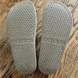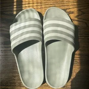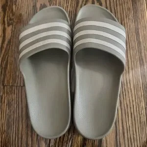Adidas slides. Color is sort of a grey/green with grey/silver stripes. Cushion slide, very comfortable! Only used a few times, look pretty new. Offers accepted! Unisex, Men’s 7, women’s 8