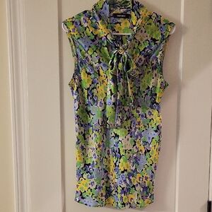 Elevate your wardrobe with this vibrant sleeveless top from Nine West. Featuring a stunning floral pattern in shades of green, blue, and purple, tan,white, and black, and tie at neck which can be tied different ways, this top is perfect for any occasion. The soft fabric and elegant design ensure both comfort and style. Worn twice. In excellent condition. 19" from pit to pit and 26" long.