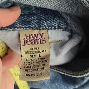 Add a touch of trendy style to your wardrobe with these Hwy Jeans distressed denim overalls. The classic blue denim is accented with stylish distressing, creating a unique and fashionable look. Perfect for casual outings, these overalls are comfortable and versatile. The size L ensures a flattering fit, while the adjustable straps provide a customizable wear.