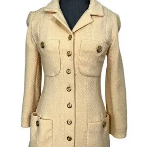 Condition: Very Good. The exterior has a few small snags and faint discoloration. All CC buttons are in-tact and shine bright/perfect. The silk lining has wear and the stitching at the neckline has started to come undone slightly.