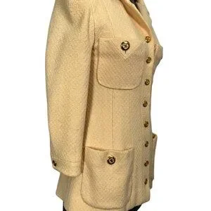 Prepare to turn heads with this gorgeous authentic vintage CHANEL 1995 Vintage CC Logo Button Blazer Jacket Size 40 (Small) crafted from a beautiful pale yellow wool, cotton blend with gold-tone signature CC logo button accents throughout.