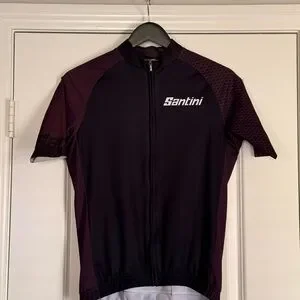 Santini cycling jersey in black and purple. Features a full front zipper and short sleeves. Size Large