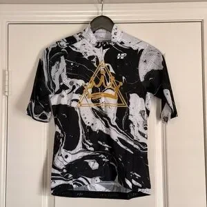 Stylish black and white cycling jersey with a unique graphic design. Features a striking gold emblem on the front. Size Medium.