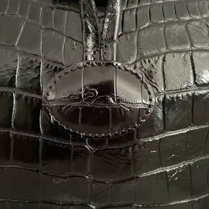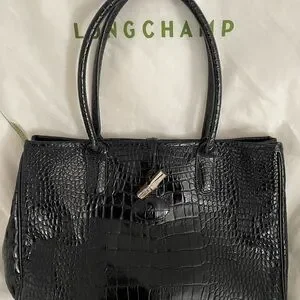 This Longchamp tote bag in black features a luxurious croc-embossed texture, offering a sophisticated and stylish look. Its structured rectangular shape and glossy finish make it a standout accessory for any occasion. The bag is designed with two rounded handles for easy carrying, ensuring both elegance and practicality.