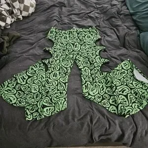 Green and Black Trippy Smiley Face pants. There are 3 cut outs on each side starting at the hips.