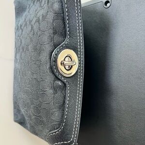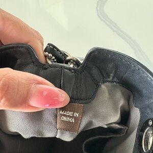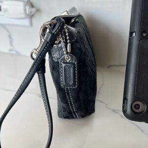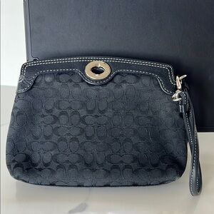 This sophisticated Coach set features a sleek black clutch with a smooth leather-like finish and a compact wristlet, both designed for versatility and style. The clutch offers a minimalist rectangular shape, while the wristlet provides a convenient option for on-the-go elegance. Perfect for any occasion, these bags combine functionality with timeless design.