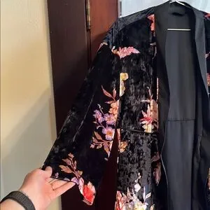 Elegant black velvet blazer with vibrant floral patterns. Perfect for adding a touch of sophistication to any outfit. Slightly oversized fit so can fit up to a medium.