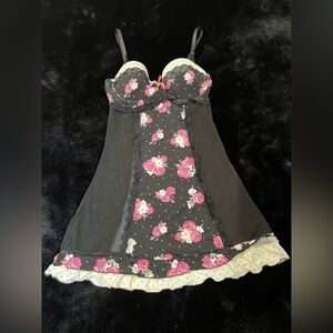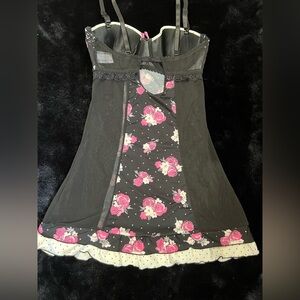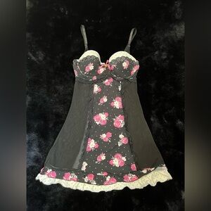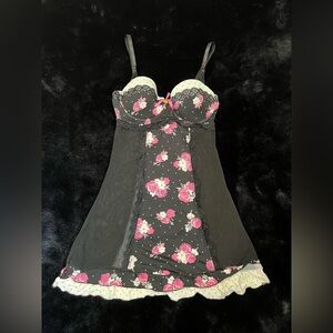 Charming Jessica Simpson babydoll slip dress in size Small. This feminine and flirty piece features a beautiful floral and polka dot print with lace trim detailing, creating a vintage-inspired aesthetic. The lightly padded cups offer support and shaping, while the sheer mesh sides add a sultry touch. Adjustable straps ensure the perfect fit, and the ruffled hem adds a playful finish.