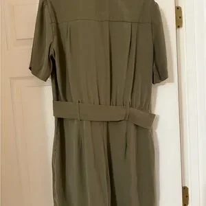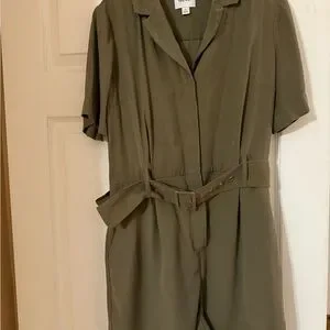 Stylish olive green jumpsuit perfect for any occasion. Features a flattering fit and elegant design. Has a few damages on the belt as shown in the pictures.