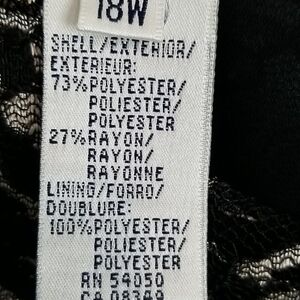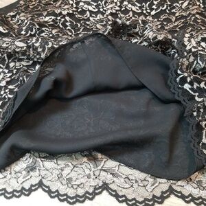 Lined. Silver & black floral lace overlay.Scallop hem. Keyhole back with button