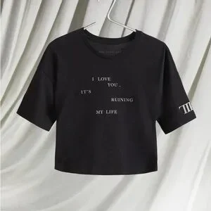 This Taylor Swift crop top showcases a chic cream and black color palette with a bold text design on the front, offering a contemporary flair. Made from a soft cotton-blend fabric, it features short sleeves and a round neckline for a comfortable fit. The cropped length adds a stylish edge to your casual wardrobe.