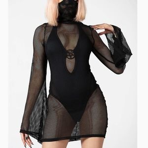 Killstar Neo-Nyx Masked Fishnet Long Sleeve Black Dress XXL NEW!