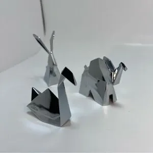 Mini Swan Elephant Rabbit origami decor for your desk. These silver-tone accents feature a sleek, modern design with geometric shapes, capturing the essence of origami art. The reflective surface adds a touch of elegance, making them perfect for contemporary home decor. Ideal for those who appreciate minimalist aesthetics. Metal, imported. Max 3” tall. Felt bottom.