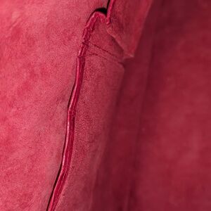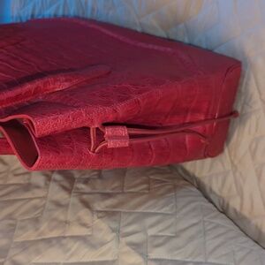 Embossed leather designer handbag/tote, with matching suede lining. Beautiful cranberry red color. Magnetic top closure and dual top handles with 7.5" drop. Interior has 1 zip pocket and 2 slide in pockets. The bottom is very clean with 4 brass feet, no stains, damage or scrapes. Overall near perfect condition, inside and out. Base measures approx. 14" x 5.5". Height approx. 12.5"