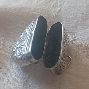 Vintage Heart Pendant in Sterling Silver is big and bold! This piece is beautiful in Sterling Silver with a scrolled repousse design all over the front and back. This piece opens up and could have been used for pills, snuff, or who knows what else. This is a large heart at about 1 1/2 inch wide and long, and the bail adds about another 1/4 inch in length. I am unsure of the age of this piece. It is stamped 925 and RM right inside the closure. This is in very good pre-owned condition with some scratching. This would be fabulous on a nice long chain.